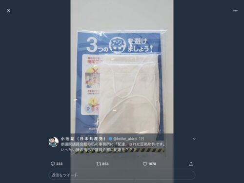 「Twitter」に共産党の小池委員長が下掲写真のような投稿をされたのが目についた。これに以下のようにリツイートした。 「国会議員の危機意識が低く、隠れ感染者がいる可能性を考えてのことでしょう。小池先生も自分の感染を想定してマスクをして下さい。布…