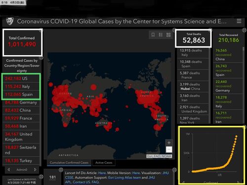 世界感染者総数 101万1490人(死者総数5万2863人) 致死率5.2%(前日5%、最高記録更新) 日本感染者総数 2495人(死者総数 62人) 致死率2.4% 【参考値】台湾感染者総数 339人(死者総数5人)(致死率0.6%) 総人口23,539,…