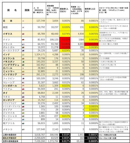 カレー料理をよく食べる国ほど「武漢型コロナウイルス」に感染しにくく、致死率が低い‼️ 「カレーをよく食べる国」(表①中の国名太字に薄卵色でマーク、以下同じ)は、世界平均と比較して、人口比感染率は約6分の1、人口比致死率は90分の1という顕著な…